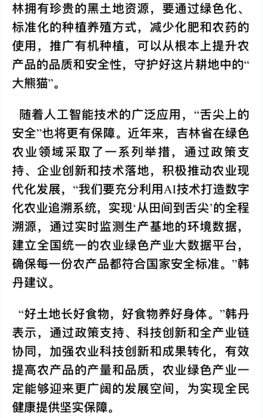他还说“健康产业的核心在于原料品质的绝对安全,只有从源头把控,才能确保消费者吃得安心、放心。”在韩丹看来,土地是农业生产的“命根子”,作为中国重要的农业大省,吉林拥有珍贵的黑土地资源,要通过绿色化、标准化的种植养殖方式,减少化肥和农药的使用,推广有机种植,可以从根本上提升农产品的品质和安全性,守护好这片耕地中的“大熊猫”。