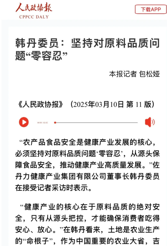 3月10日,韩丹委员在接受《人民政协报》采访时表示,“农产品食品安全是健康产业发展的核心,必须坚持对原料品质问题‘零容忍’,从源头保障食品安全,推动健康产业高质量发展。”